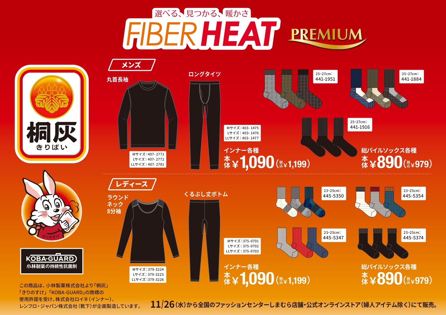 しまむら『桐灰(きりばい)』コラボを2025年11月26日(水)~販売します。FIBERHEAT(ファイバーヒート)のインナー、タイツ、ソックスがラインナップ!