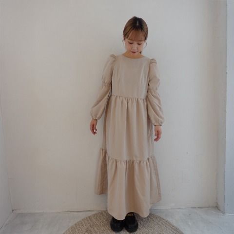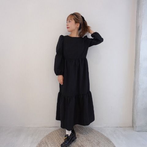 ふんわりボリュームのあるパフスリーブと、切り替えを入れたティアードデザインで、女性らしい華やかさを演出。後ろ開きのディテールもさりげないポイントになっています。