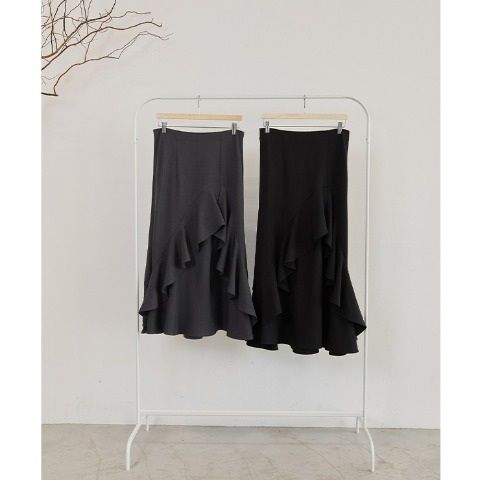 腰回りはすっきりとタイトめで、裾に向かって広がるラインになっております。特にフリルによって裾にボリュームが出るため、マーメイドラインに近いエレガントな印象を与えます。