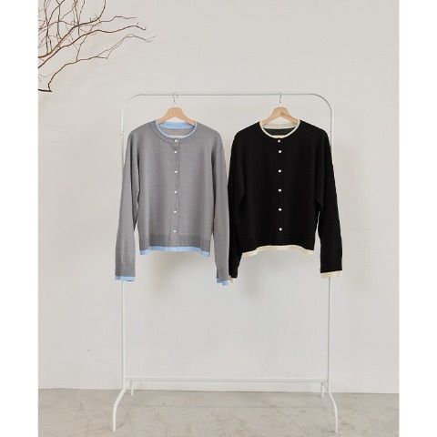 クラシックな雰囲気に遊び心を加えた配色レイヤード風のクルーネックカーディガンです。