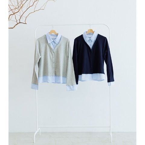 襟元、袖口、裾から別の色が覗いており、一枚でブラウスやカットソーを重ね着しているようなこなれ感が出るデザインです。ブラックには清涼感のあるホワイト、グレーには爽やかで上品なサックスブルーが組み合わされており、どちらもコントラストが効いています。