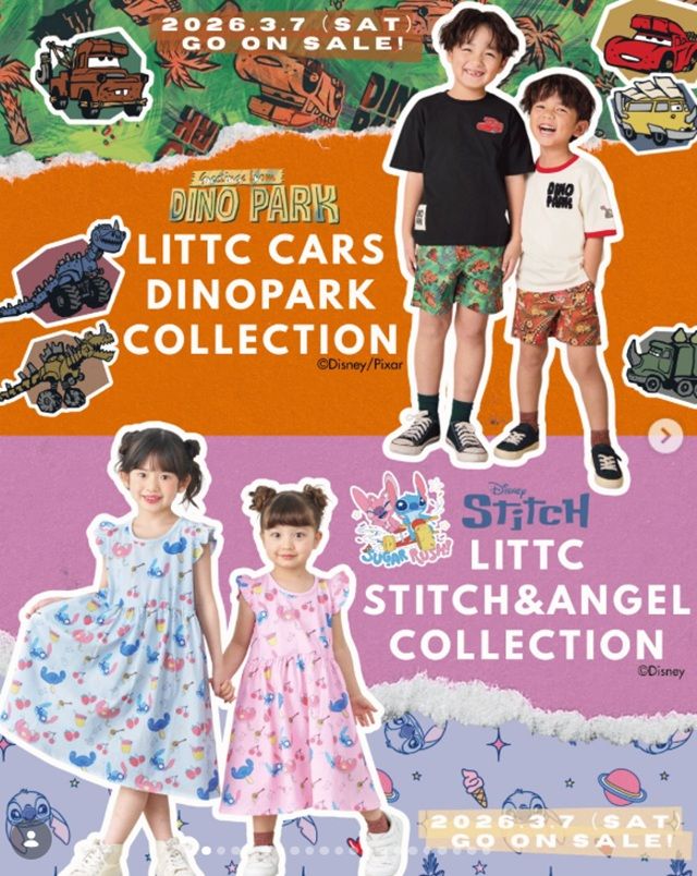 しまむら『Littc(リトシー)』コラボの新作を、2026年3月7日(土)~販売します。カーズ〈恐竜公園〉、スティッチ&エンジェルの夏アイテムがラインナップ!