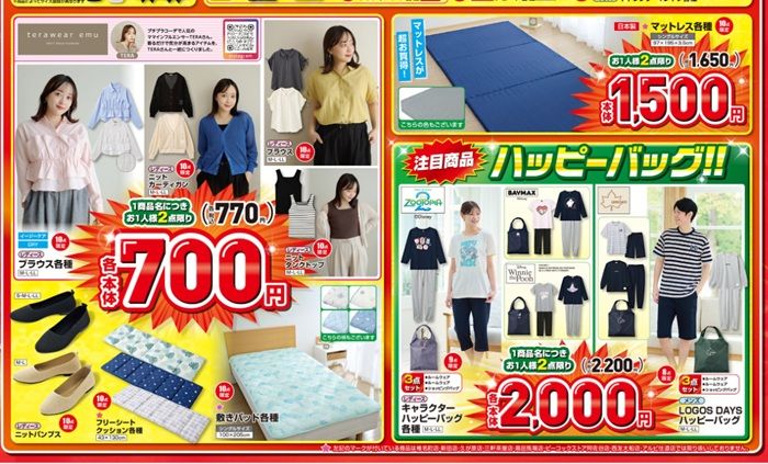しまむら『LOGOS(ロゴス)』コラボのハッピーバッグが2025年4月29日(火・祝)~販売します。お得なルームウェアのセットになります。