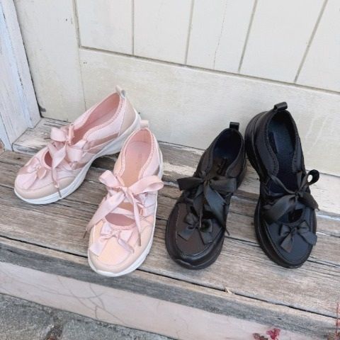 つま先のサテンリボンとレースアップデザインが目を引くバレエ風スニーカーです。