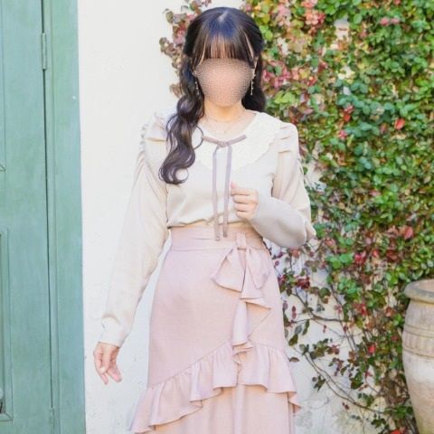 裾と袖口にはフリルをあしらっており女性らしい可愛い雰囲気のデザインです。
