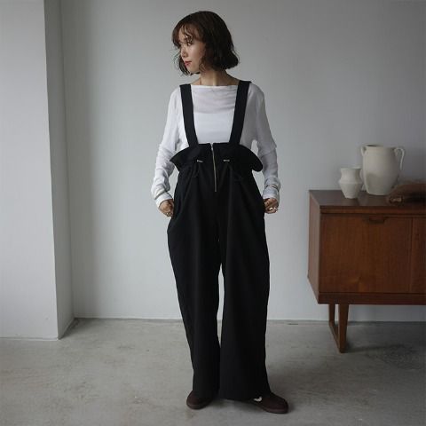 中肉のツイル素材のサス付きワイドパンツです。肩紐を取り外してパンツとしても着用可能です。前ジップデザインとウエストのストッパー金具がデザインのポイントです!肩紐の長さは釦で調整可能。パンツは左右ポケット付き。