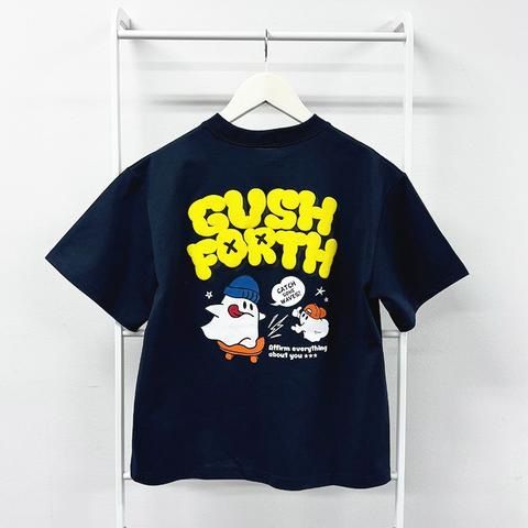 深みのあるネイビーにイエローロゴが映えるデザインTシャツ。