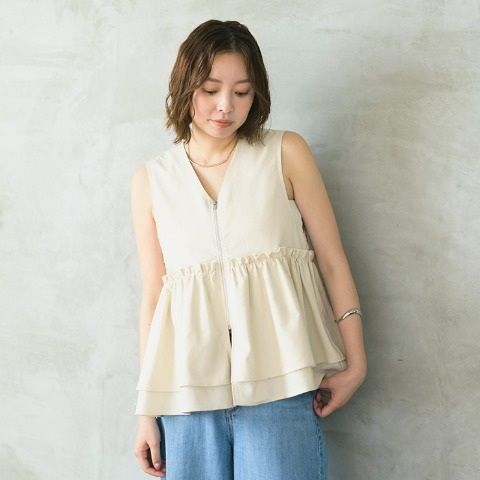 さらっとした素材で仕立てられた、春夏にぴったりのペプラムベストです。シンプルな生地にギャザーを加えることで立体感をプラスしました。タイトスカートやIラインシルエットのボトムスと好相性。ワンピースに重ねるとバランスが取りやすく、スタイリングの幅が広がります。カジュアルな装いにさりげない甘さをプラスでき、キャミソールやブラトップの上に重ねたり、プルオーバー感覚で着用したりと、さまざまな着こなしを楽しめるアイテムです。