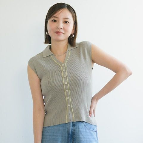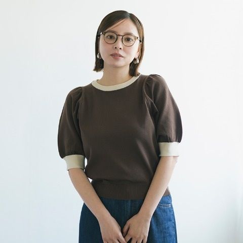 衿と袖口の配色トリミングがポイントのニットトップスです。