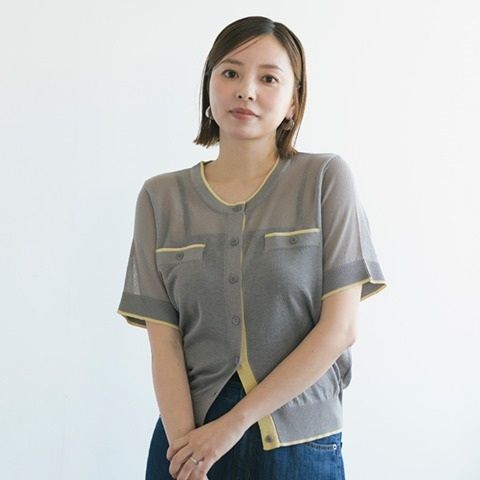 フェイクポケット付きのシアーニットカーディガン。