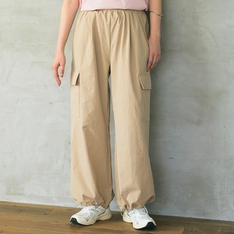 ややビンテージ感のある、ストレッチ性を備えた合繊素材のカーゴパンツ。フラップ付きのカーゴポケットがデザインアクセント。裾にはドロスト金具を施し、ワイドシルエットと裾を絞ったジョガー風シルエットの2WAYで着こなしを楽しめます。ウエストは総ゴム仕様で、着脱しやすく快適な穿き心地。内紐付きのため、サイズ感の微調整も可能です。デイリーからアクティブシーンまで幅広く活躍する、汎用性の高い一本です。