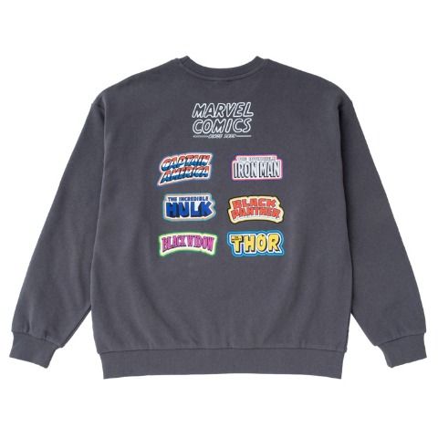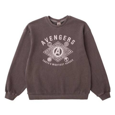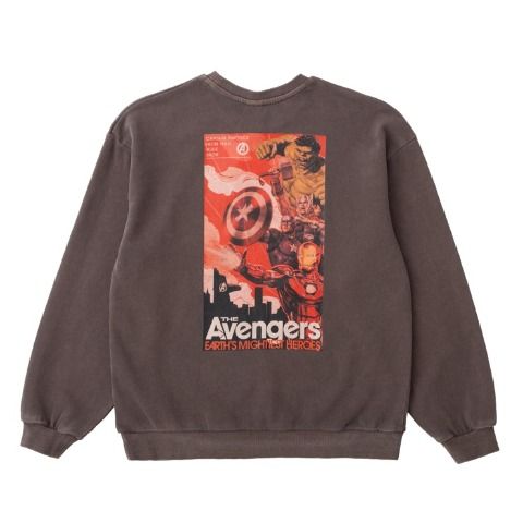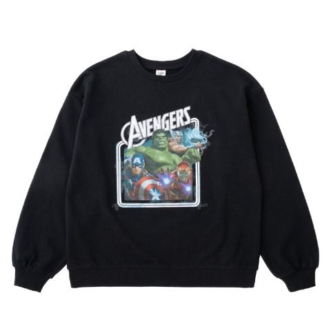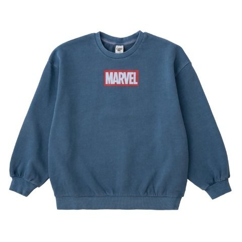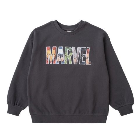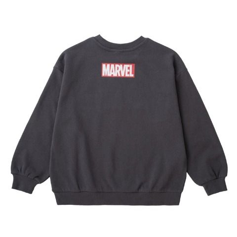 MARVELのロゴとキャラクターを組み合わせたプリントをのせた、裏毛素材のトレーナーです。