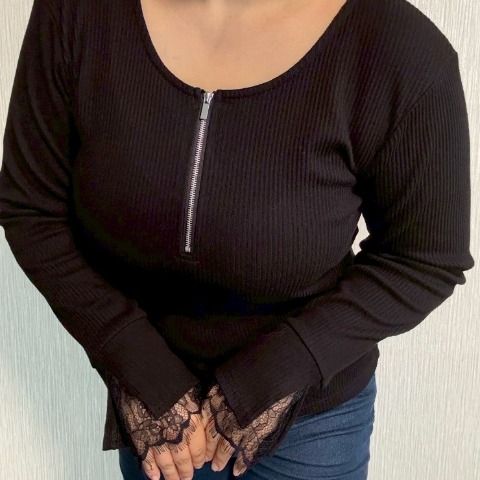 袖レースが女性らしさを引き立てる、ZIPデザイントップス。