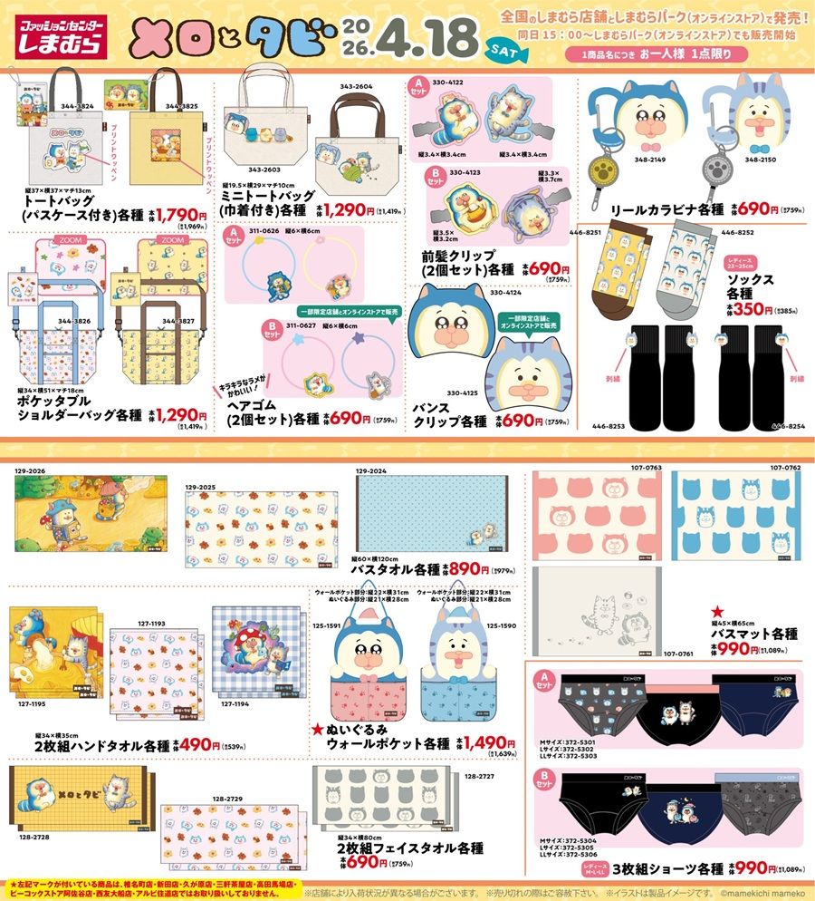 しまむら『メロとタビ』コラボを、2026年4月18日(土)~販売します。ファッション雑貨、タオル、インテリアグッズなど種類豊富にラインナップ!