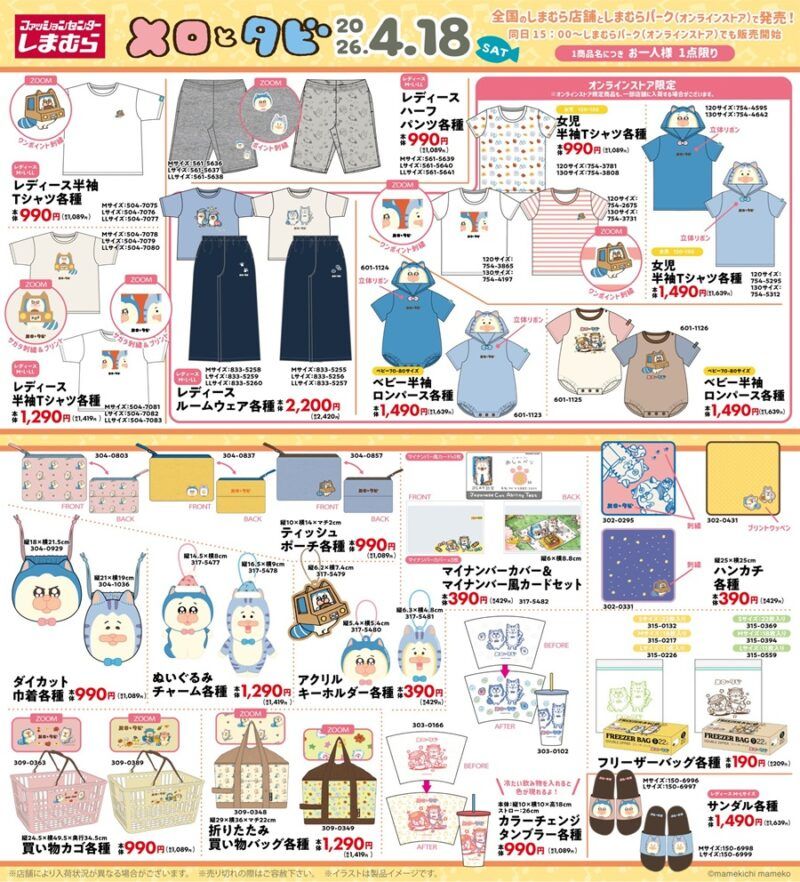 しまむら『メロとタビ』コラボを2026年4月18日(土)~販売します。アパレル、雑貨、インテリアなど種類豊富にラインナップ!