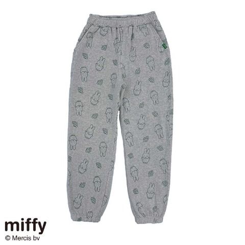 『miffy』のロングパンツです。両手をあげたmiffyとお花の総柄デザインが特徴的です。
