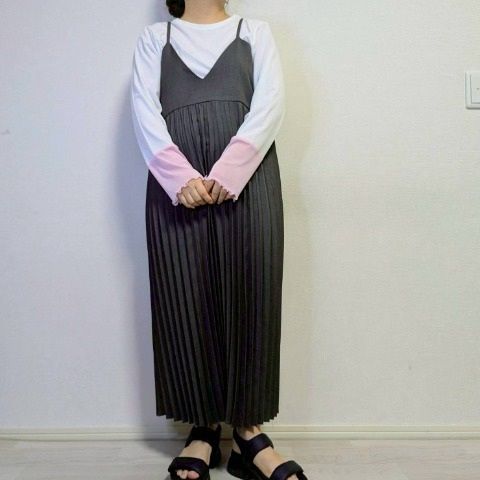 繊細なプリーツが縦ラインを強調し、すっきりとしたシルエットを演出するプリーツワンピースです。キャミソールデザインで抜け感があり、レイヤード次第でオールシーズン着用可能です。
