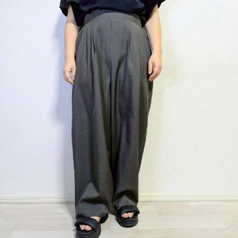 フロントタックが腰回りをすっきり見せつつ、ワイドシルエットで体型カバーも!