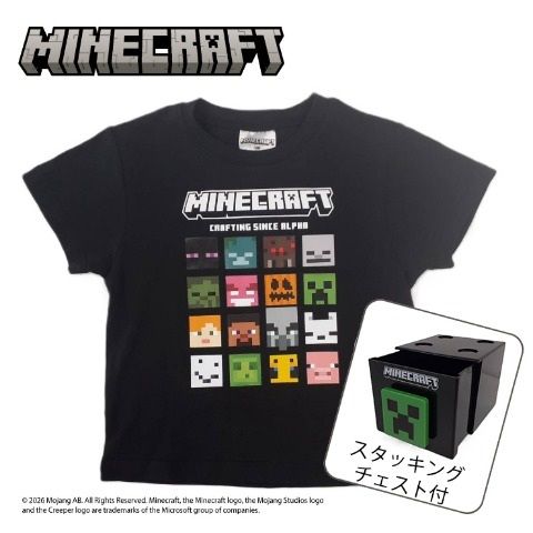 大人気マインクラフトのTシャツです♪ブラックTシャツはプリントが良く映えてかっこいい!スタッキングチェストもついたお得なセット!マインクラフト好きにはたまらないアイテムです♪