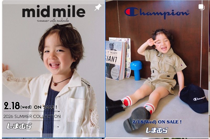 しまむら『muku(むくぞ~)mid mile(ミッドマイル)』コラボの新作を、2026年2月18日(水)~販売します。夏の子供服、チャンピオンのデイリーに活躍しそうな洋服がラインナップ!