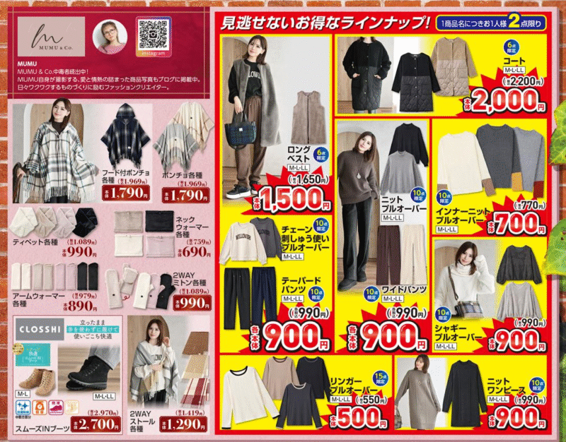 しまむら『MUMU』コラボの発売日、ラインナップ、種類、品番、販売方法、販売状況、再販売、口コミ、オンライン通販、販売店舗、チラシなどをまとめます。)