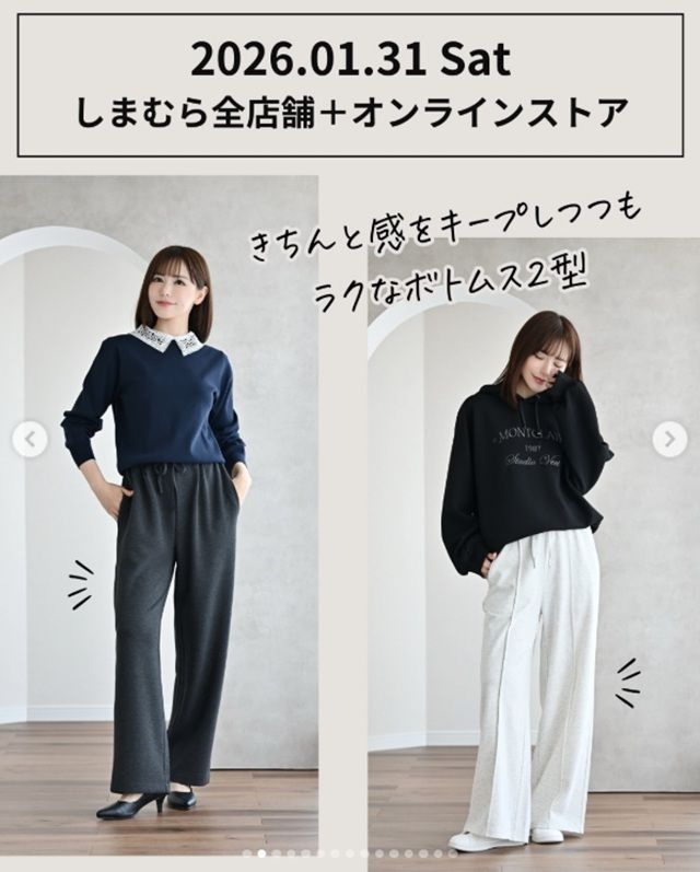 しまむら『MUMU』コラボの新作を、2026年1月31日(土)~販売します。「きちんと見え」と「ラクさ」を両立したイージーパンツなどがラインナップ!
