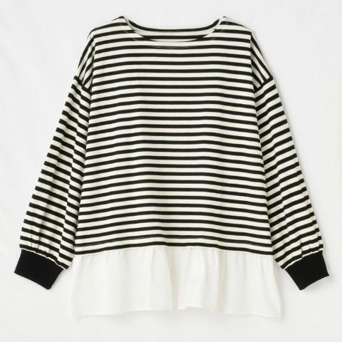 定番のサカリバボーダーの裾を布帛フリルで切り替えたペプラムデザインのトップスです。ふんわりと広がるシルエットが、気になるお腹や腰まわりをさりげなくカバーしてくれます。デニムはもちろん、カットパンツやナロースカートなど、さまざまなボトムスと相性抜群。着回し力の高い万能トップスです。
