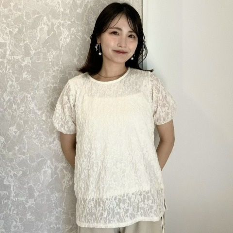 繊細なレースジャガード袖が映える上品Tシャツ。