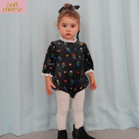 花柄がかわいい、ベロアのベビーロンパースです。