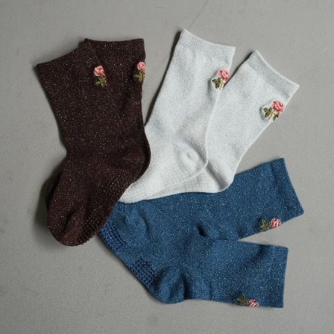 ラメソックスに繊細なバラの刺繍を施したクルーソックスです。