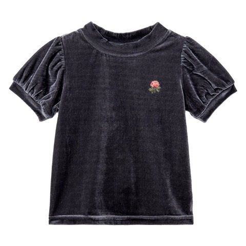 ワンポイントの刺しゅうがかわいい、ベロア素材のTシャツです。