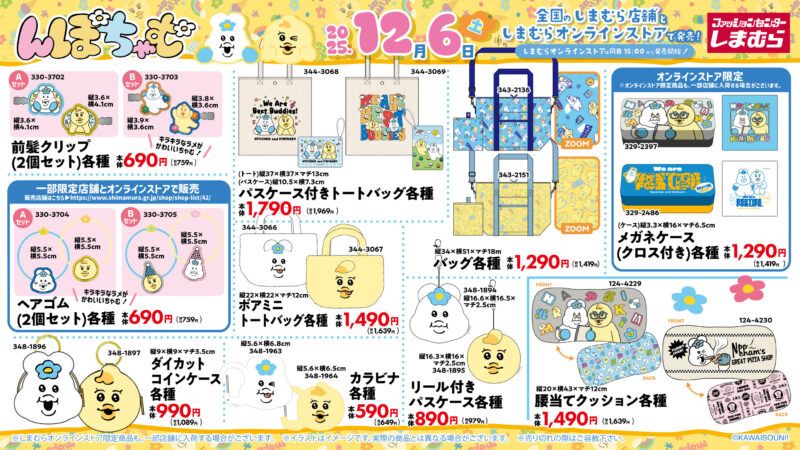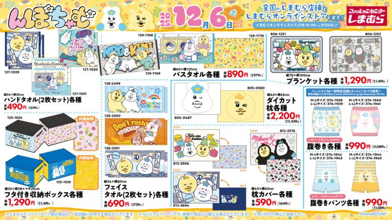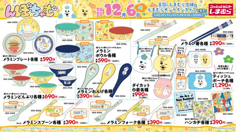 しまむら『んぽちゃむ』コラボの新作を、2025年12月6日(土)~販売します。エコバッグ、ぬいぐるみチャーム、お守り風アクキー、食器、ハンカチ、バッグ、クッション、ブランケット、ルームウェア、ソックスなどがラインナップ!