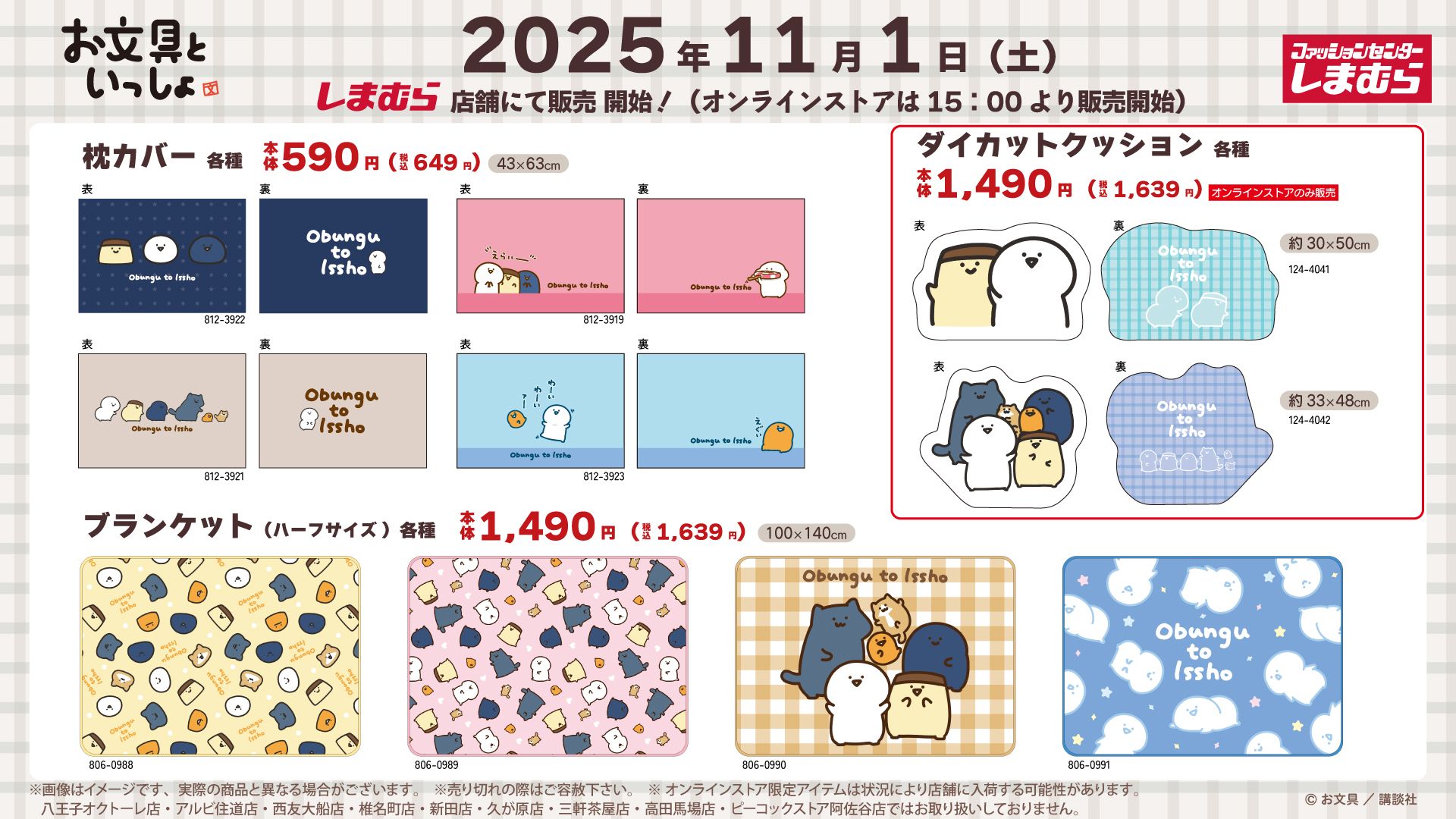 しまむらでは、2025年11月1日(土)~『お文具といっしょ』コラボの新作を販売します。ブランケット、クッション、寝具、収納ボックス、ソックス、タオル、トートバッグ、ヘアクリップ、寝具などがラインナップ!可愛い雑貨が充実です!