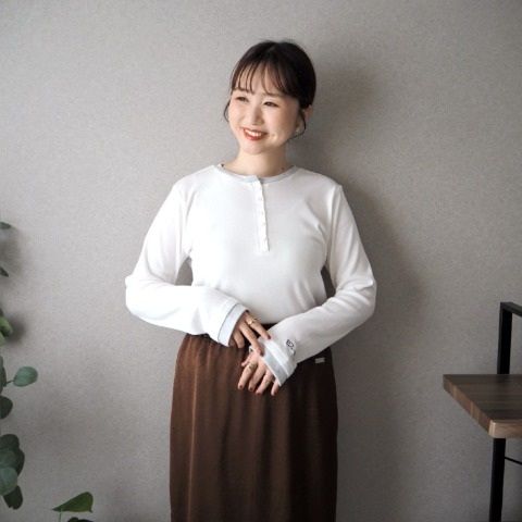 どんなボトムスとも合わせやすい、シンプルなデザインが魅力的。