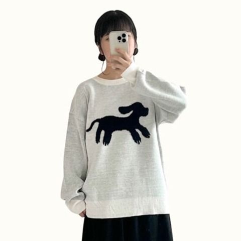 ループ編みでイヌモチーフをあしらったニットプルオーバー
