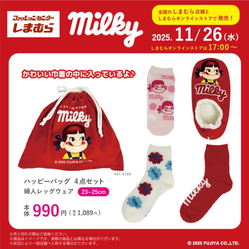 しまむら『ミルキー・カントリーマアム・ルック』コラボを2025年11月26日(水)~販売します。ソックス+ルームカバー+巾着セットのハッピーバッグがラインナップ!