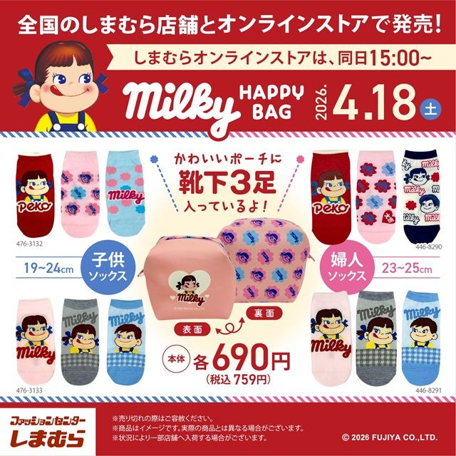 - しまむら×不二家『ペコちゃん、ミルキー』コラボのソックスセットのハッピーバッグ(福袋)が2025年3月29日(土)より発売!