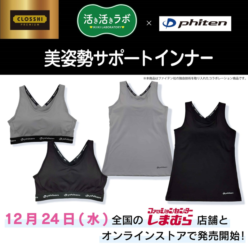 しまむら『phiten(ファイテン)』コラボを2025年12月24日(水)~販売します。背中クロス仕様で自然と背筋を意識させてくれる「ながら姿勢ケア」インナーがラインナップ!
