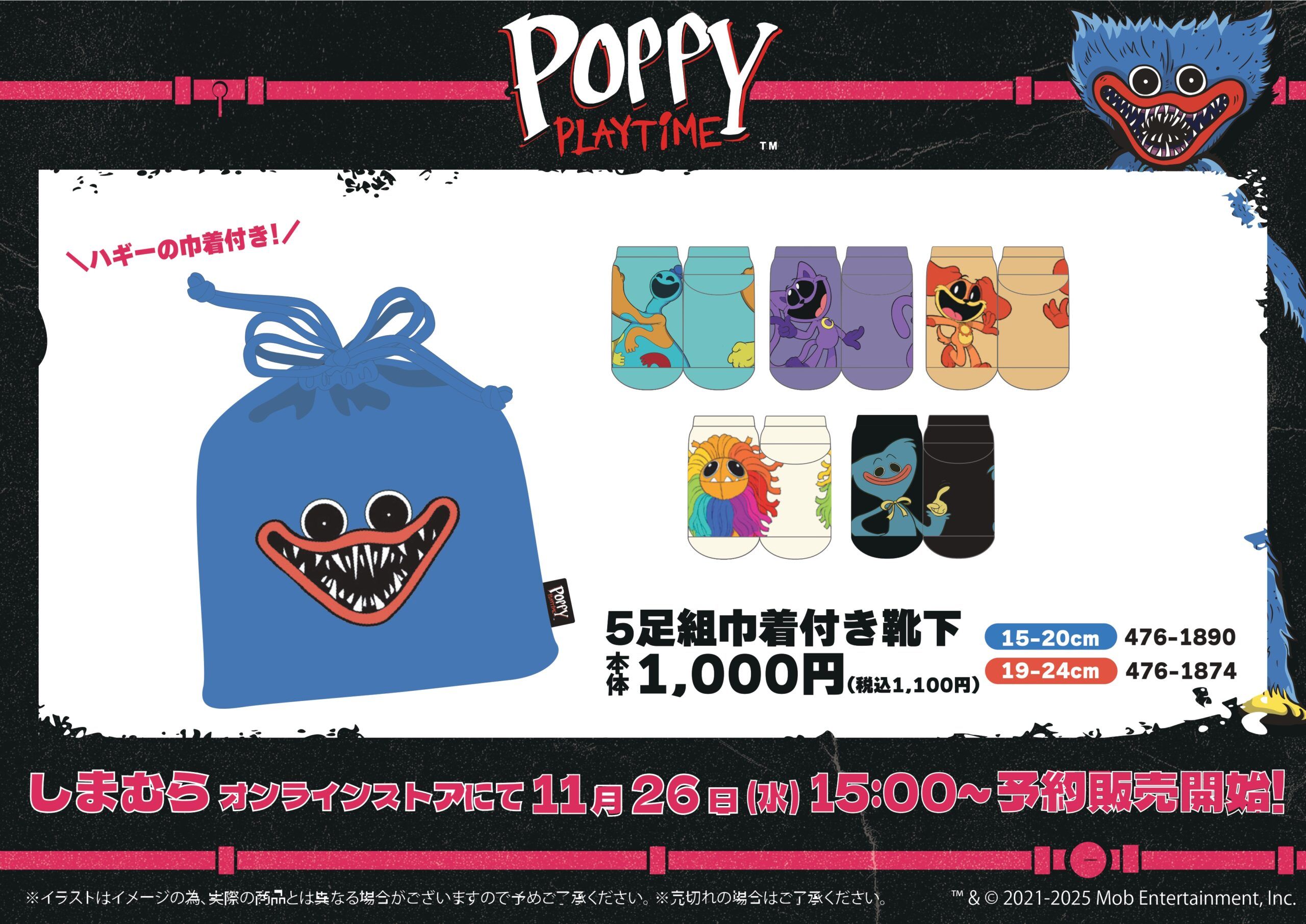 しまむら『ポピープレイタイム』コラボを2025年11月26日(水)~販売します。ソックス5足セット+ハギーの巾着付きがラインナップ!