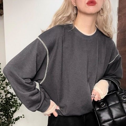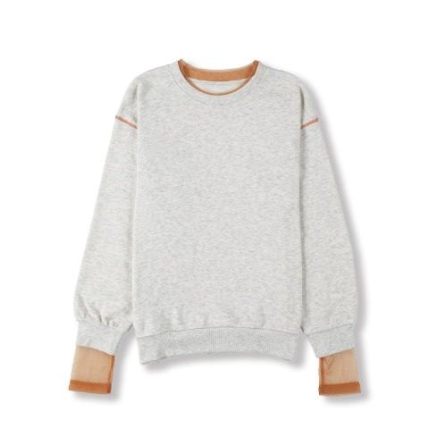 配色カラーがポイントのシアー素材を衿と袖にドッキングさせた裏毛素材のスウェットトップス。