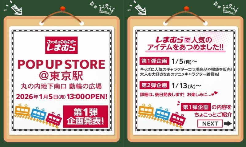 しまむらは、2026年1月5日(月)より、東京駅丸の内地下南口にて、ファッションセンターしまむら・ベビー・子供用品バースデイによる期間限定POP UP STOREを出店します。駅構内へのPOP UP STOREの出店は今回が初めてとなります。