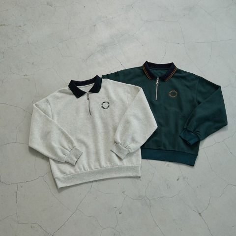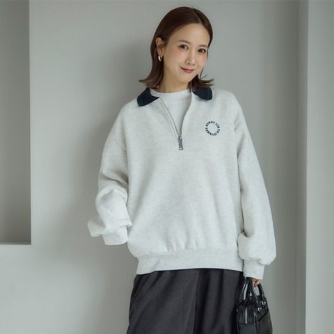配色リブがアクセントになったハーフジップトップスです。左胸のサークルロゴ刺繍がさりげないポイントに。1枚で着映えする存在感があり、ゆったりとした程よいサイズ感で、どんなボトムスともバランスよくコーディネートできます。