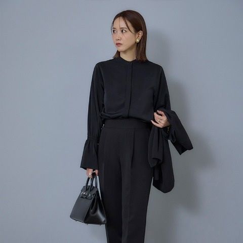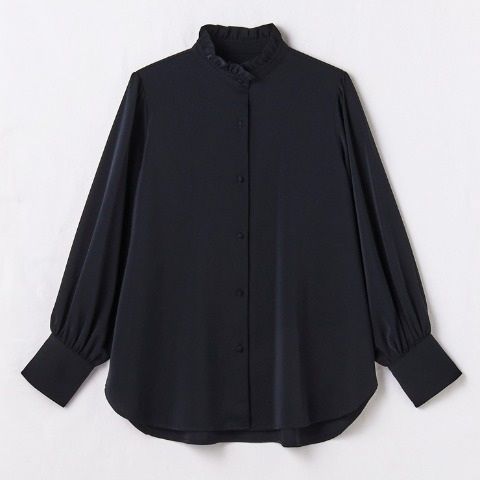 バンドカラーで首元はスッキリ見えしながらも、ロングカフスのフリル袖なので華やかさを演出してくれます。