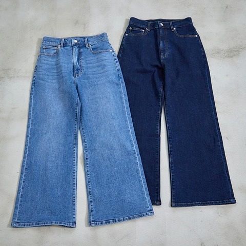 ストレッチデニムを使用したワイドフレアデニムパンツ。