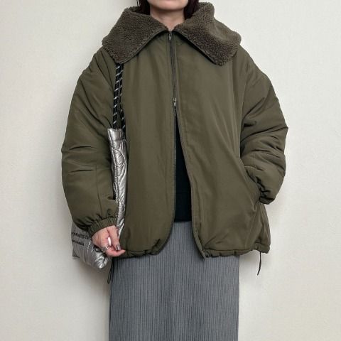 ゆるっとしたオーバーサイズのボア襟付きアウター。