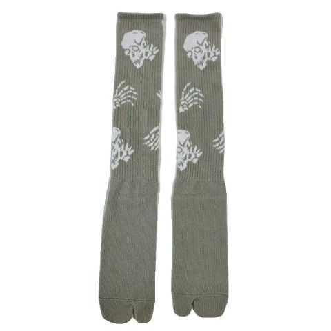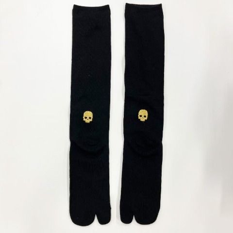 ドクロの顔と手の総柄がインパクト大なハイソックスです。