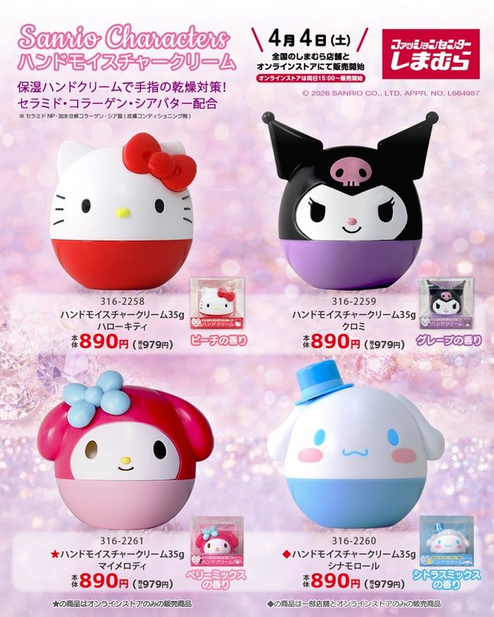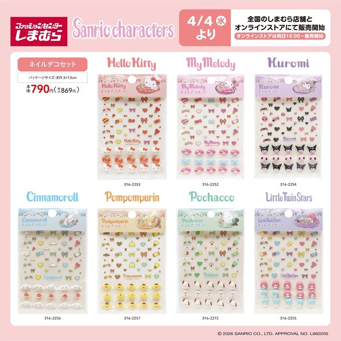 しまむら『サンリオ』コラボを2026年4月4日(土)~販売します。ネイルデコシール、ハンドモイスチャークリームがラインナップ!