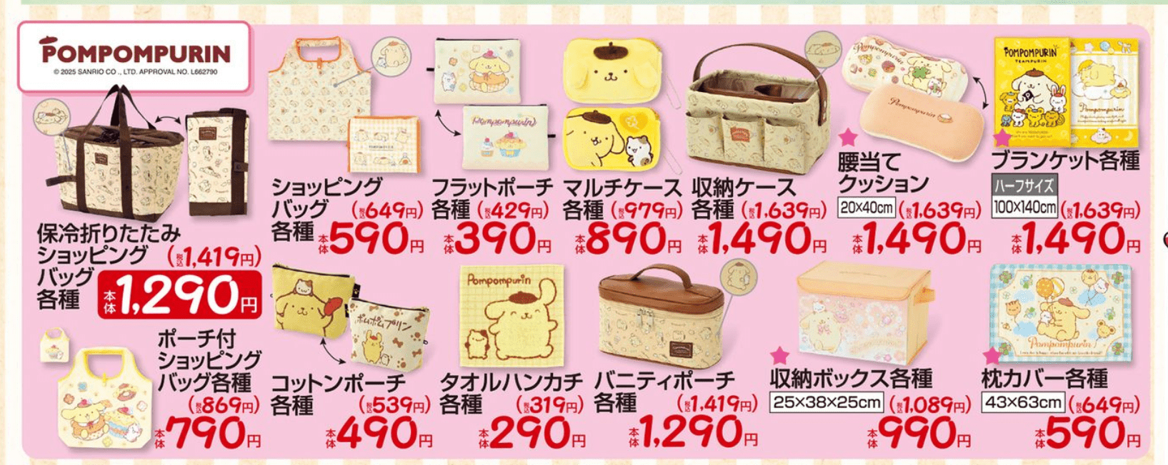 しまむら『サンリオ』コラボを2025年9月10日(水)~販売します。ポムポムプリンのポーチやバッグ、インテリアグッズなどがラインナップ!
