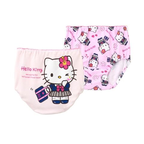 大人気 サンリオキャラクターズより ハローキティ2枚組ショーツが登場。ギャル風にハローキティが制服を着た絵柄をプリントしたショーツと総柄ショーツの2枚組ショーツです。