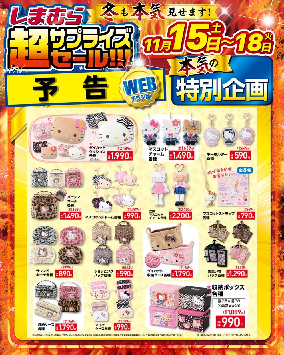 しまむら『サンリオ』コラボの新作を、2025年11月15日(土)~販売します。ハローキティのデザインを中心に、ギャルキティ、アニマル柄、冬のアパレル、インテリア、寝具などがラインナップ!しまむら超サプライズセールで大型コラボが発売!